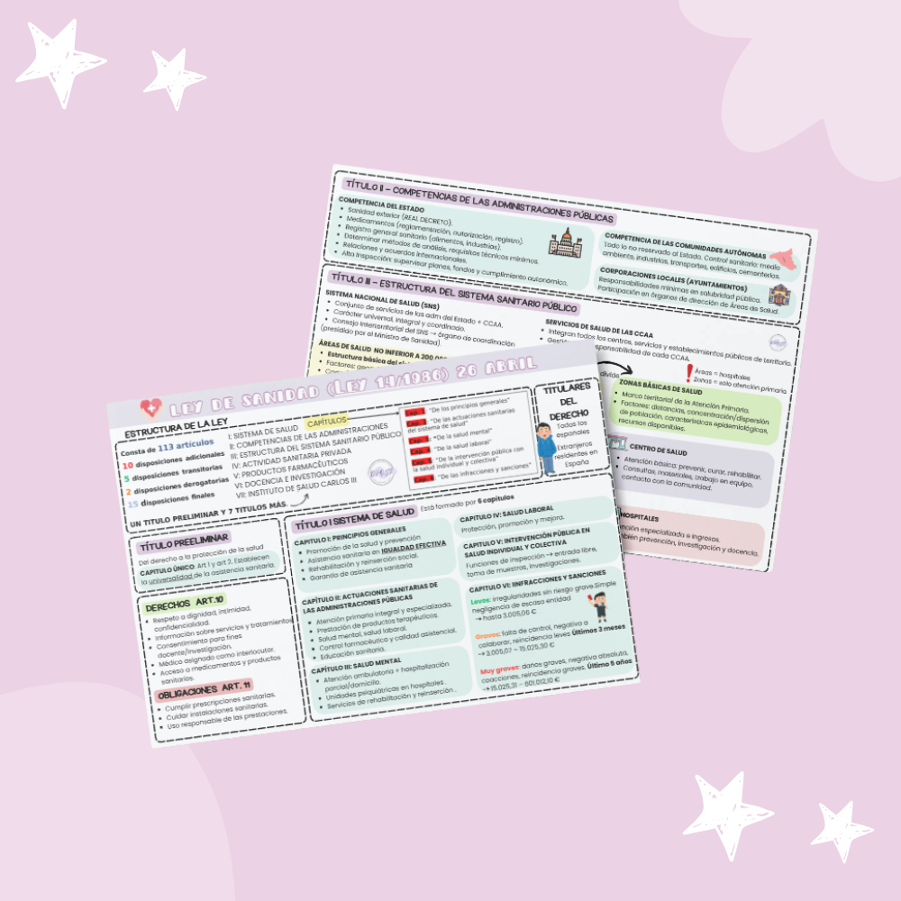 Este pack reúne las principales leyes sanitarias resumidas en una sola página cada una, con la información verdaderamente importante para oposiciones sanitarias.