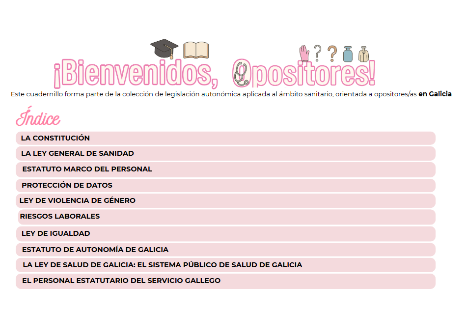 Este cuadernillo forma parte de la colección de legislación autonómica aplicada al ámbito sanitario, diseñado específicamente para opositores y opositoras en Galicia que necesitan estudiar y memorizar la normativa esencial sin enfrentarse a textos legales largos y complejos.